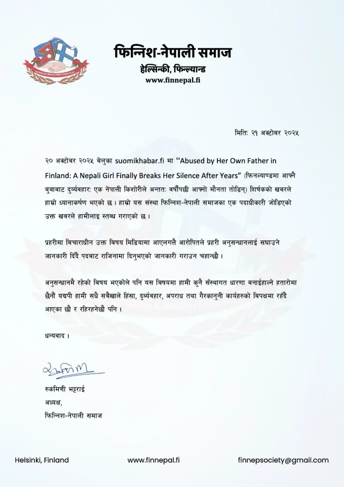 Shortly after the article’s publication, the Finnish–Nepalese Society (Suomalais–Nepalilainen Yhdistys) also issued a public statement in Nepali acknowledging awareness of our report. The society stated that one of its officials connected to the story had resigned from their position and that, as the case is under police consideration, the organization would not comment further until investigations conclude. The society reaffirmed its stance against all forms of violence and abuse.