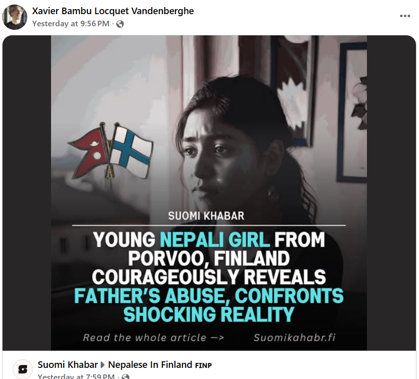 Recently, Suomi Khabar published an article covering the story of a young Nepali immigrant girl in Finland who had publicly shared her experience of alleged abuse by her own father.
